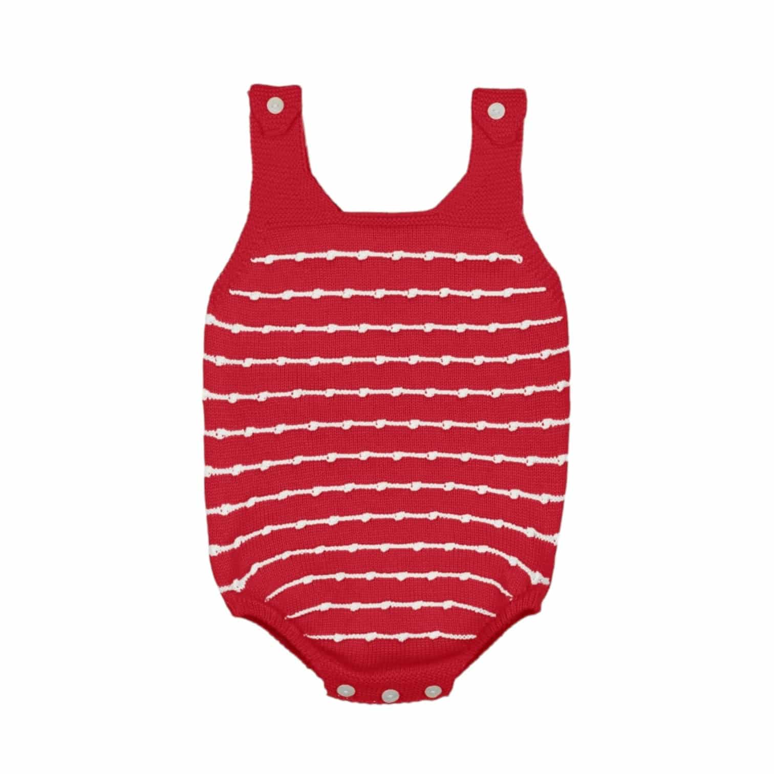 Pelele tirantes de hilo de algodón en color rojo combinado con rayas blancas.