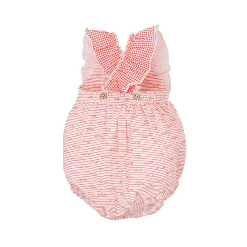 Pelele con estampado de rayas en color rojo y blanco. Detalle volantes en los tirantes.