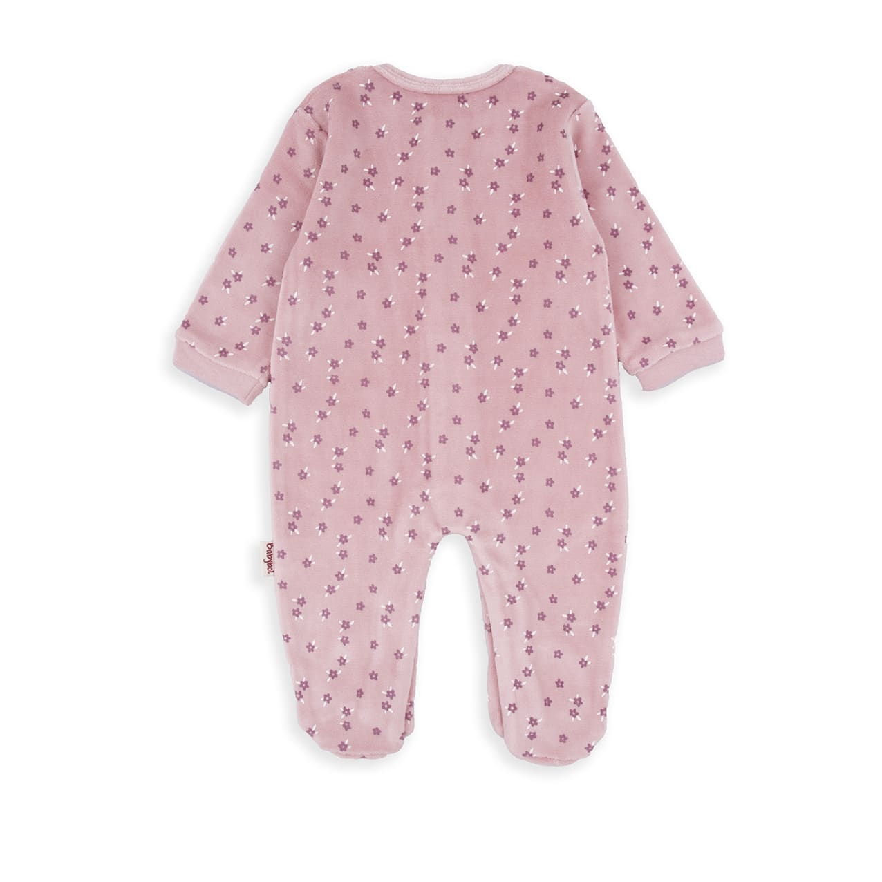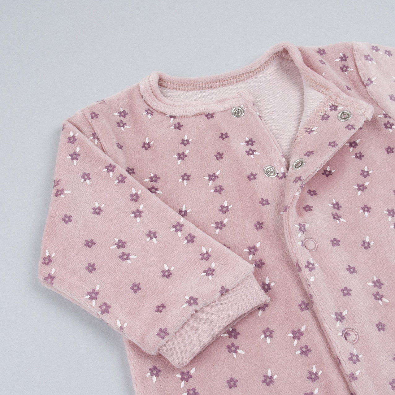 Pelele terciopelo 100% algodón de color malva con estampado de flores en blanco.