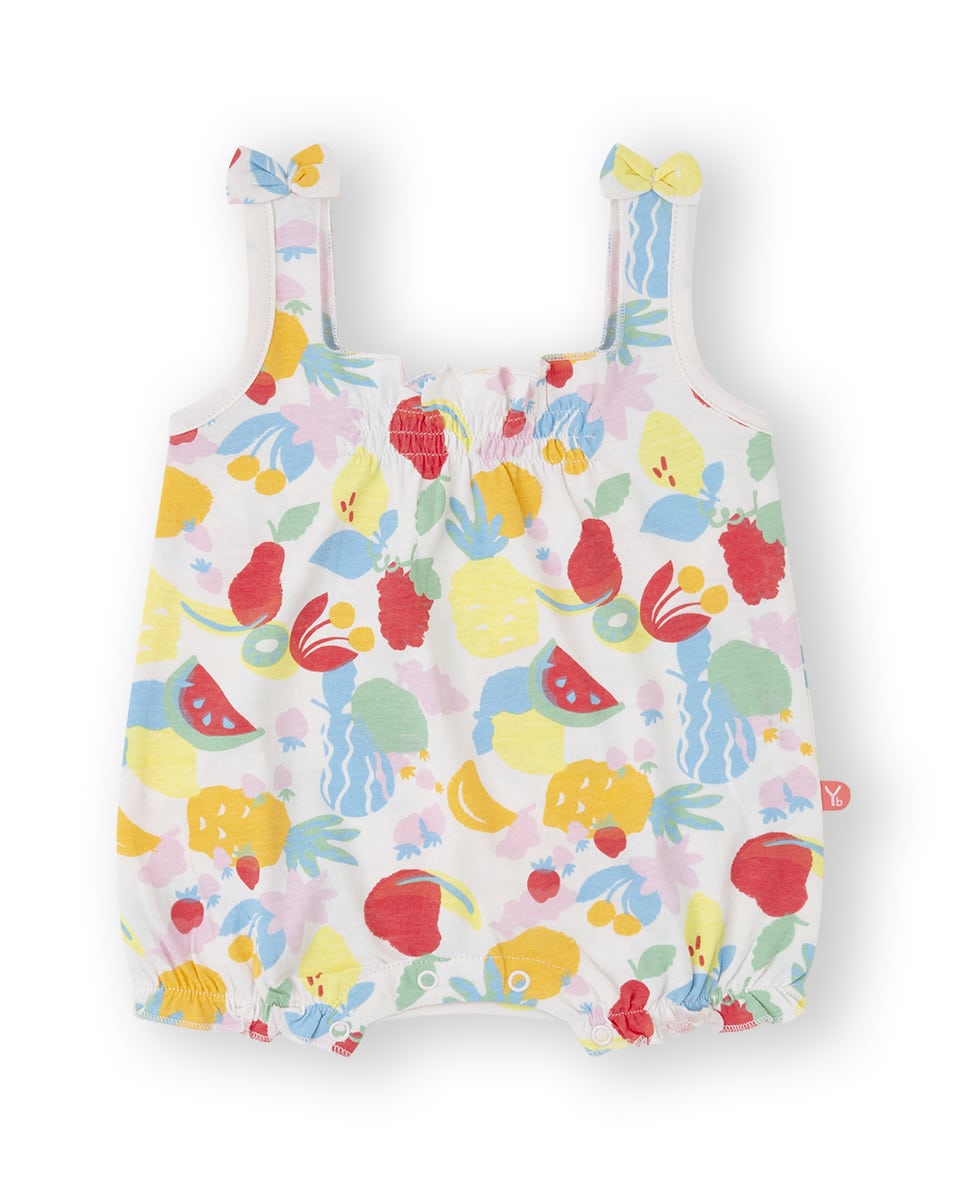Pelele tirantes 100% algodón en color blanco con estampado de frutas de colores.