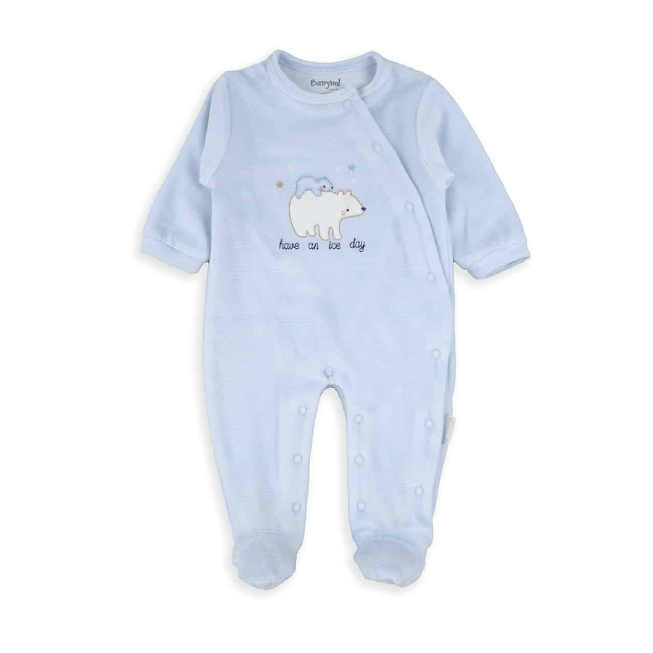 Pelele de terciopelo 100% algodón en color azul celeste con osito bordado en el pecho.