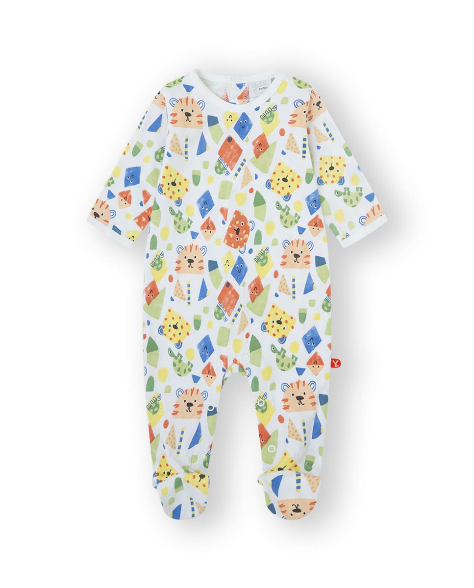 Pelele 100% algodón de color blanco con estampado de animalitos de colores.