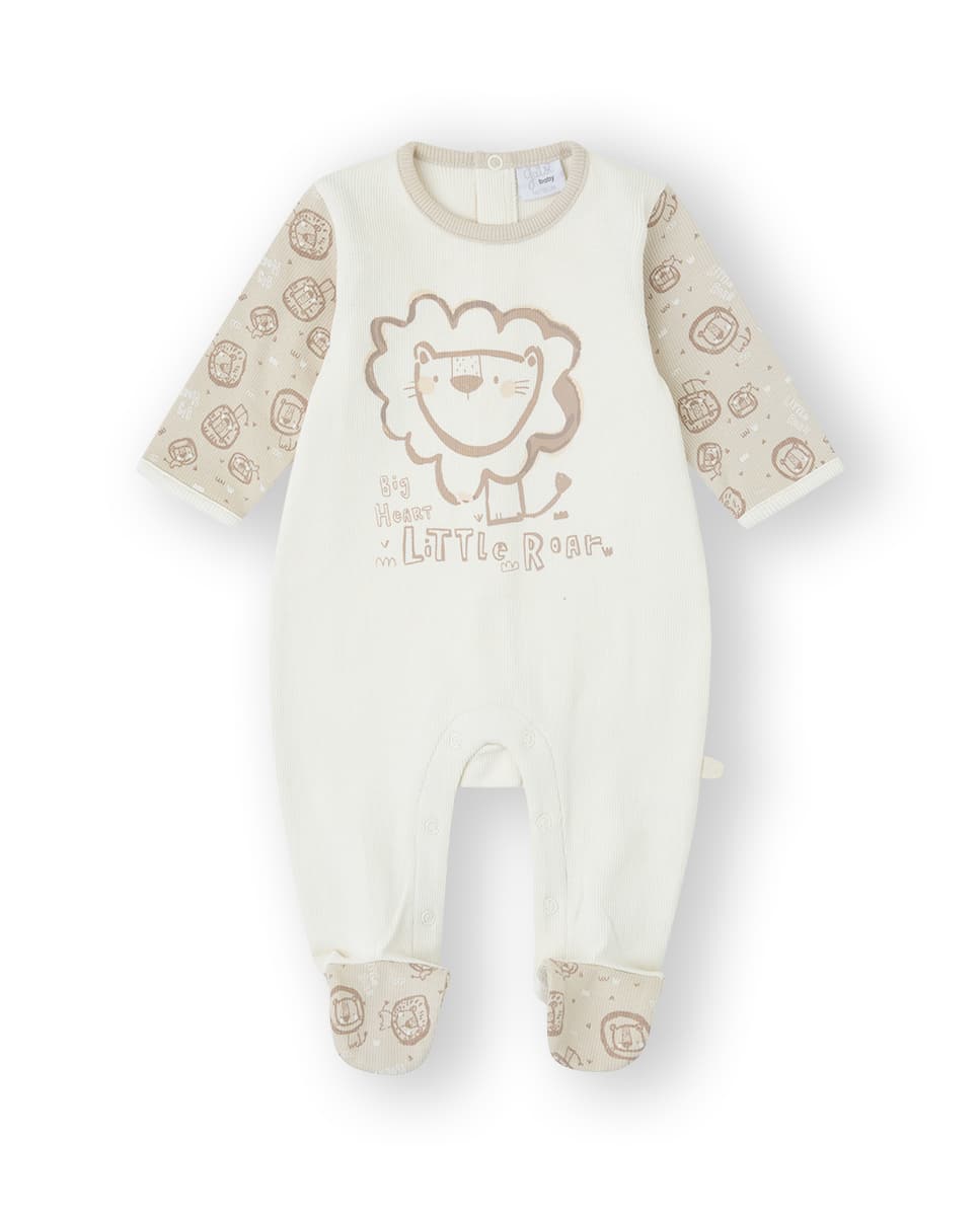 Pelele 100% algodón con canalé en color beig y tostado con estampado de leones.
