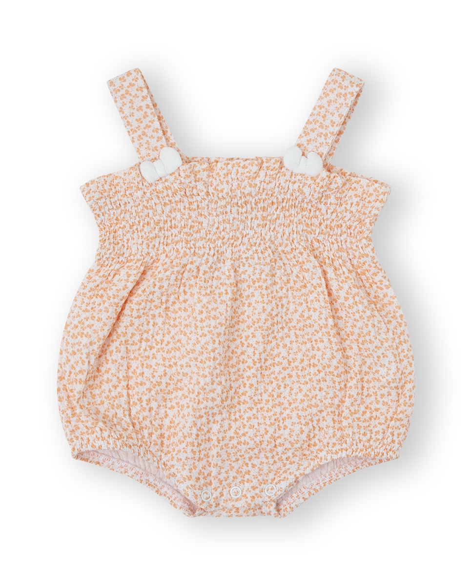 Pelele con tejido bambula en color naranja. Estampado de florecitas y detalle lazos en los tirantes