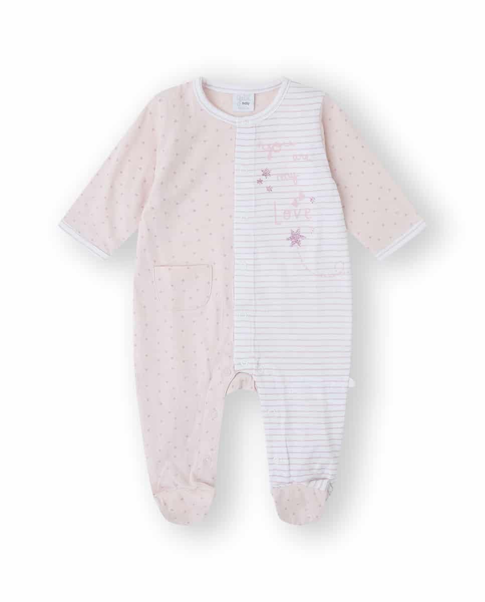 Pelele 100% algodón de color rosa y blanco con estampado de estrellitas y rayas.
