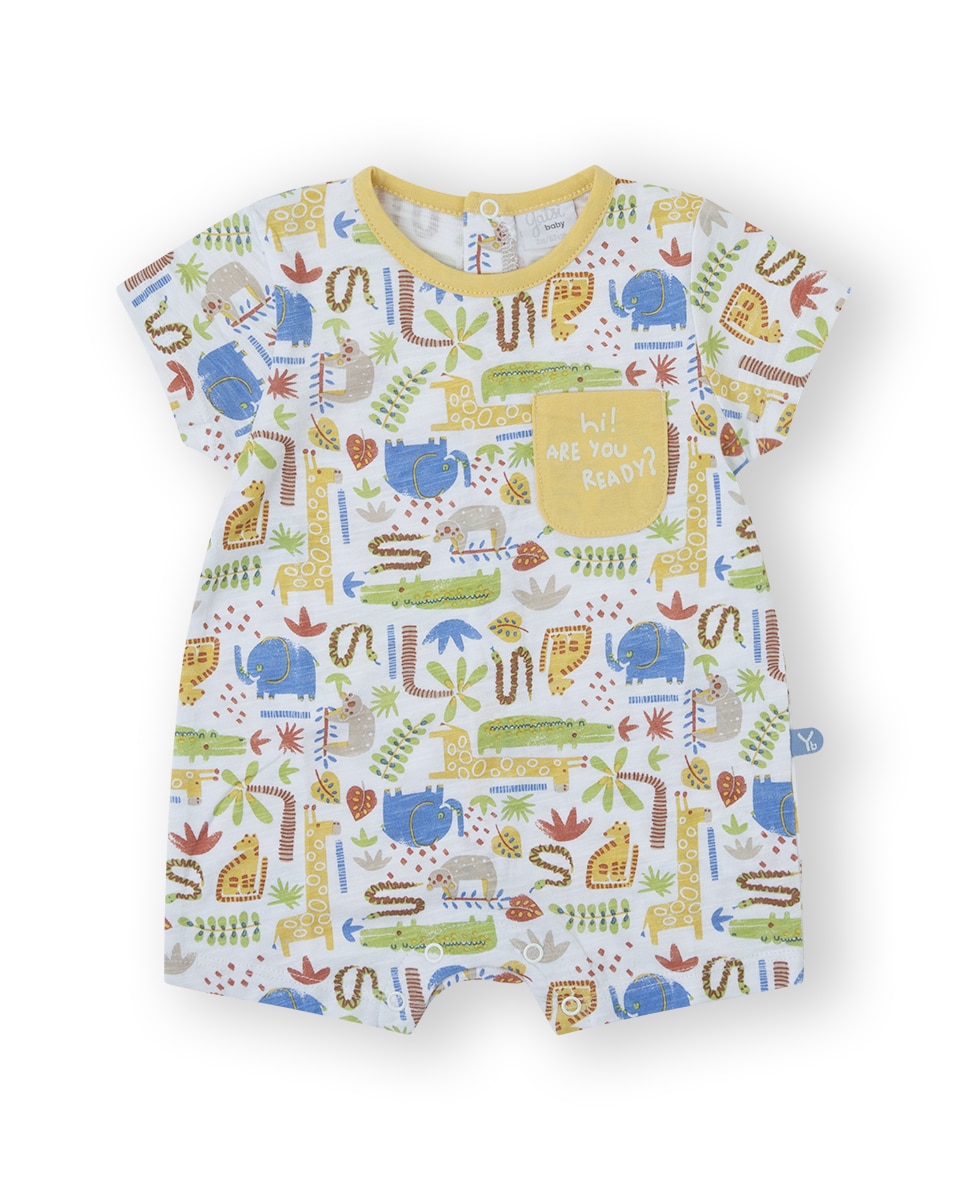 Pelele 100% algodón en color blanco y mostaza con estampado selva.