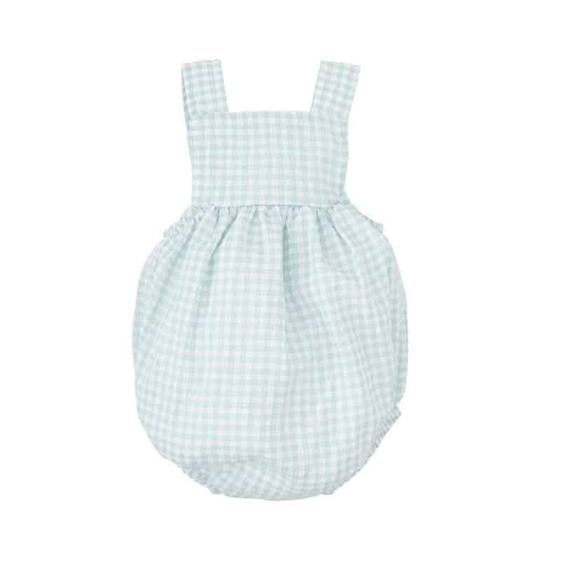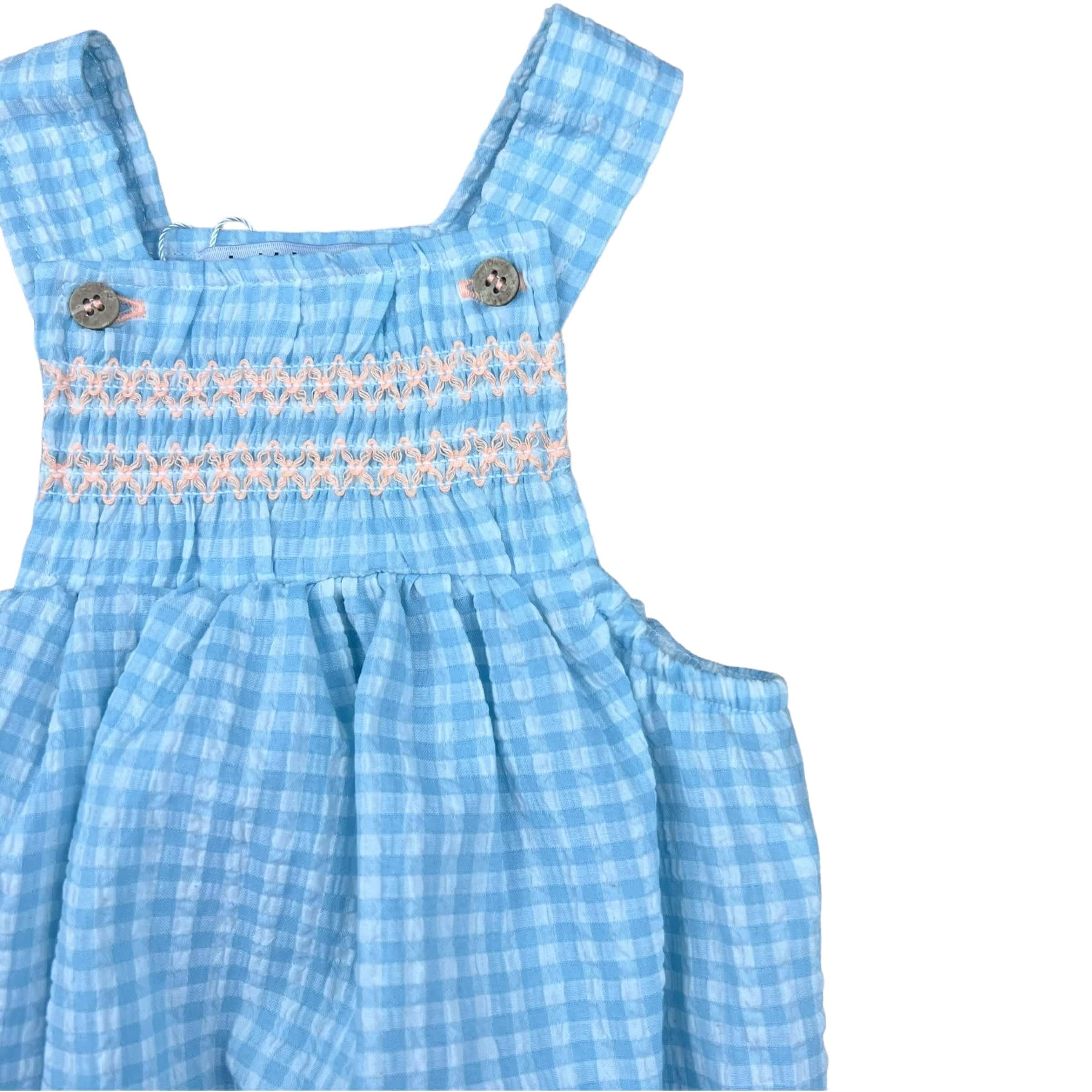 Pelele con estampado de cuadro vichy en azul turquesa y blanco. Detalle nido de abeja en el pecho de color naranja neón.
