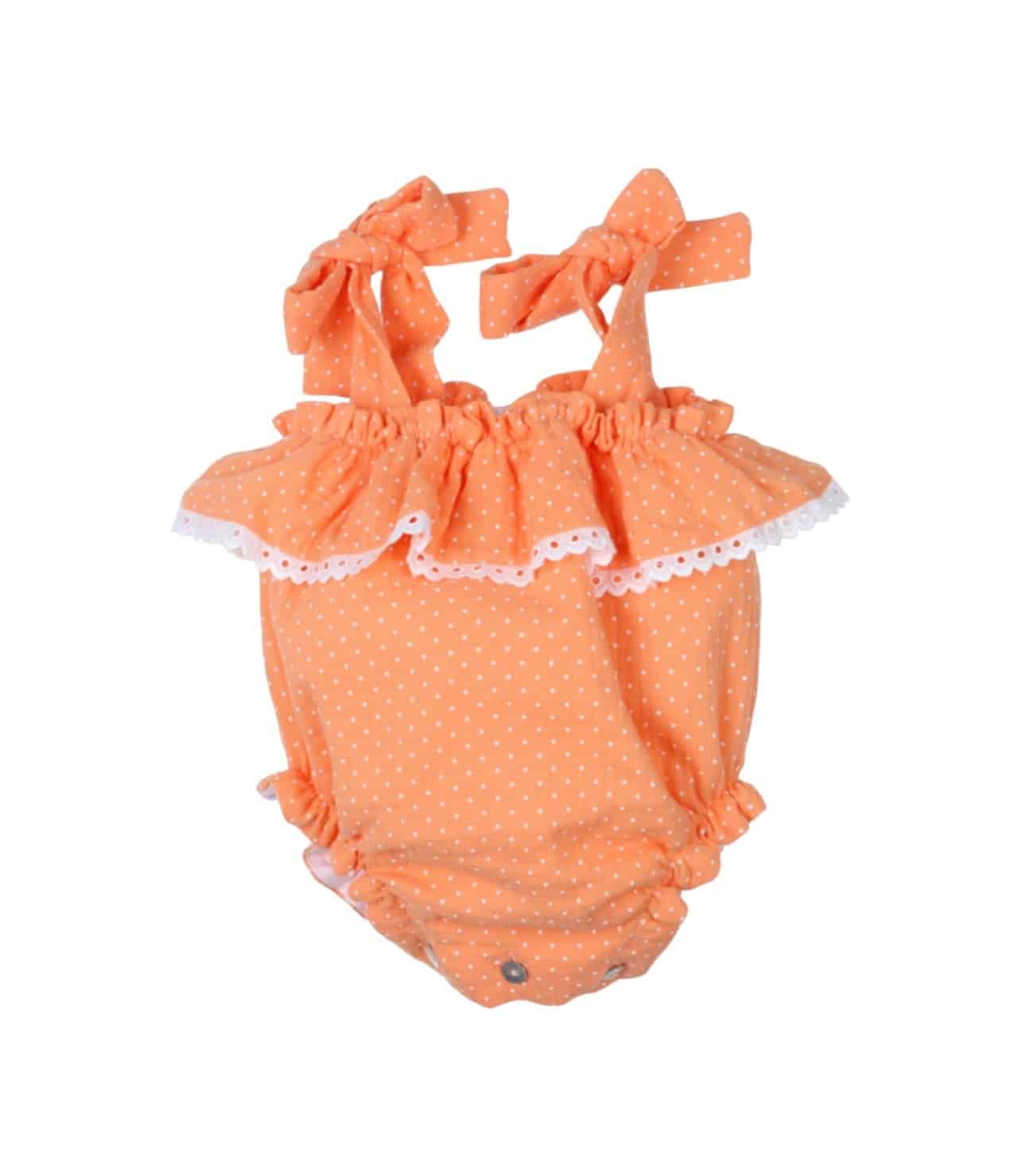 Pelele tejido bambula en color naranja con estampado de topitos blancos.