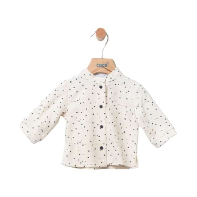 Peto en azul marino y beig con apertura en los tirantes. Camisa con cuello mao de color crudo con estampado estrellas azul marino.