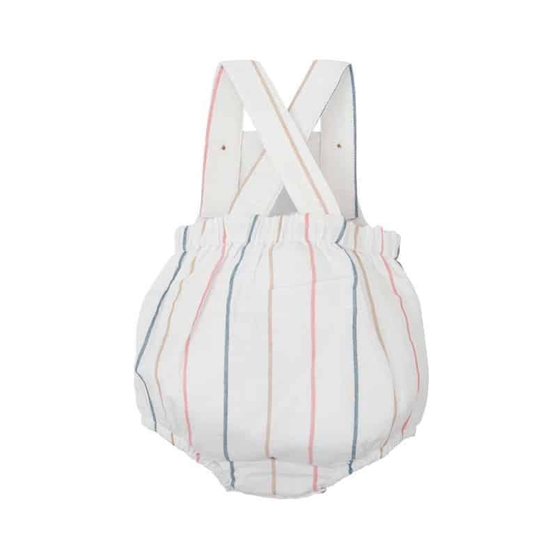 Peto de color blanco con estampado de rayas de colores. Detalle bolsillo en el pecho.