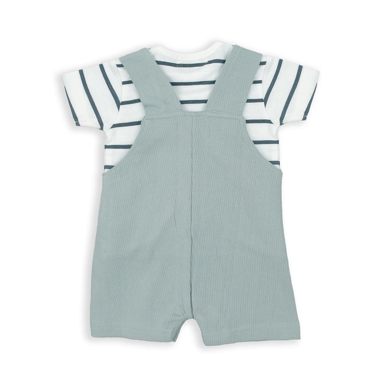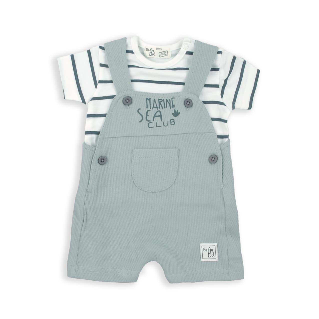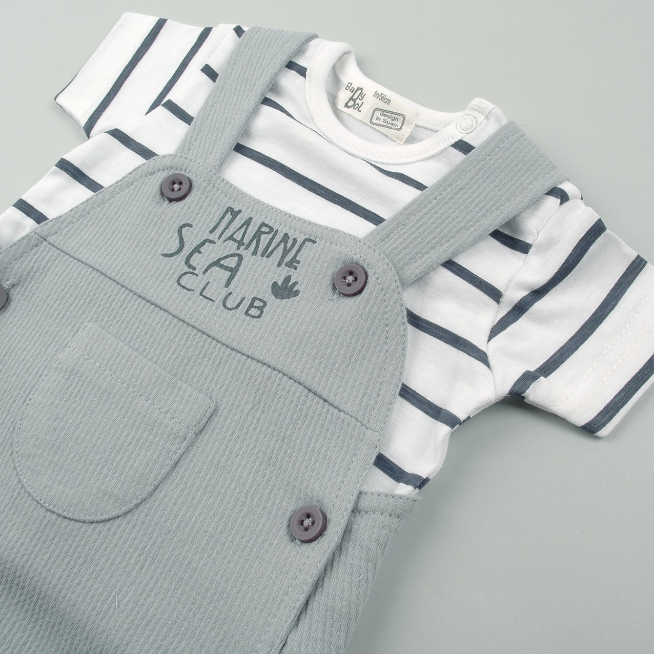 Peto de color azul empolvado con tejido gofre. Apertura en los tirantes y la parte delantera e inferior para facilitar el cambio del pañal.