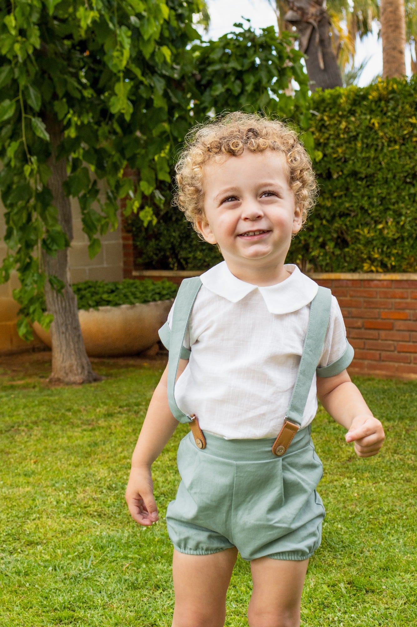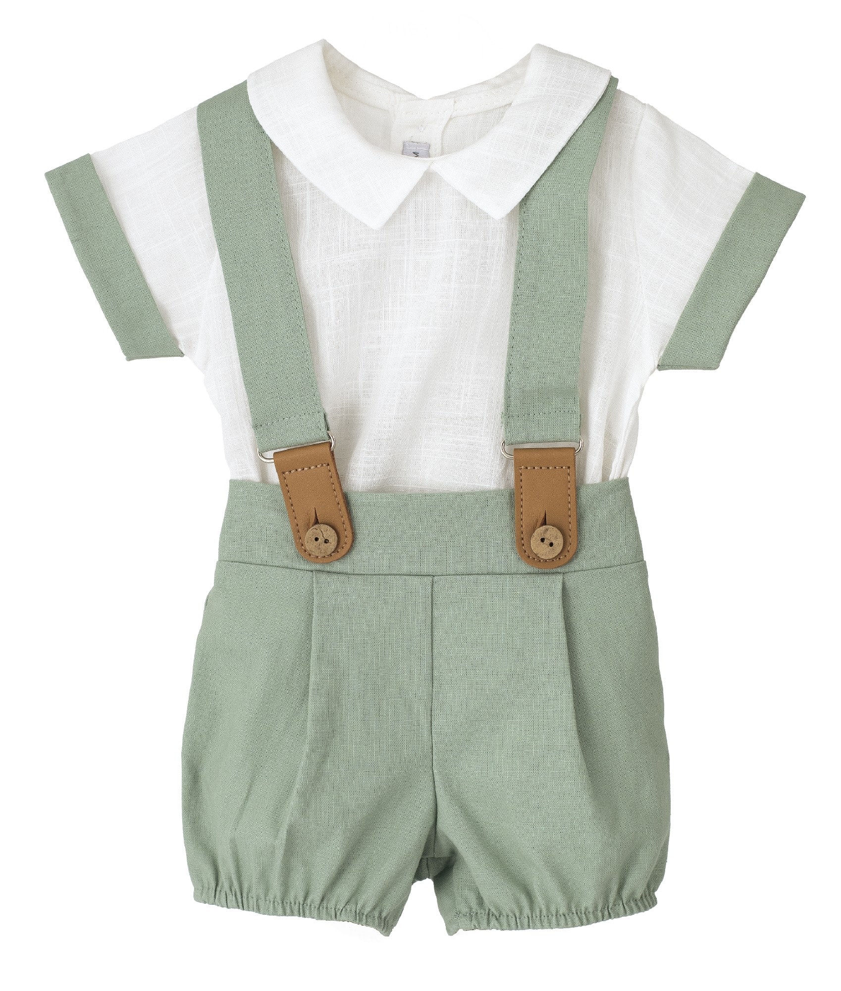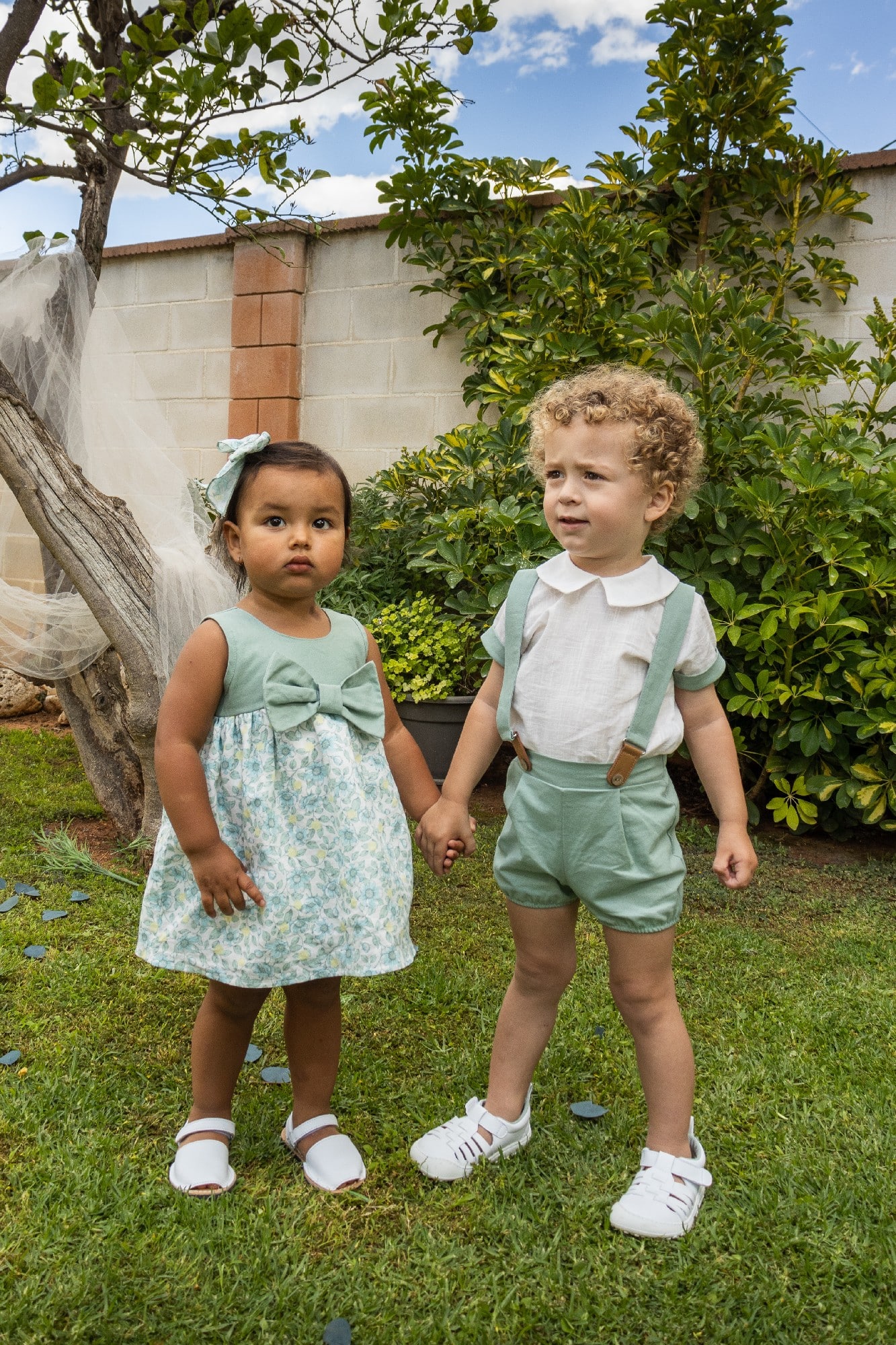 Peto de lino con tirantes en color verde menta. Detalles y apertura en la cintura en color marrón.