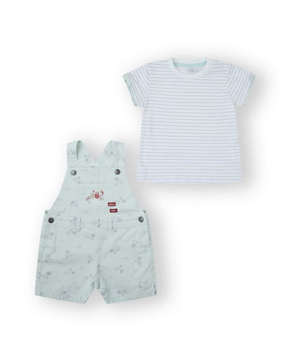 Peto de color verde menta con estampado de palmeras.