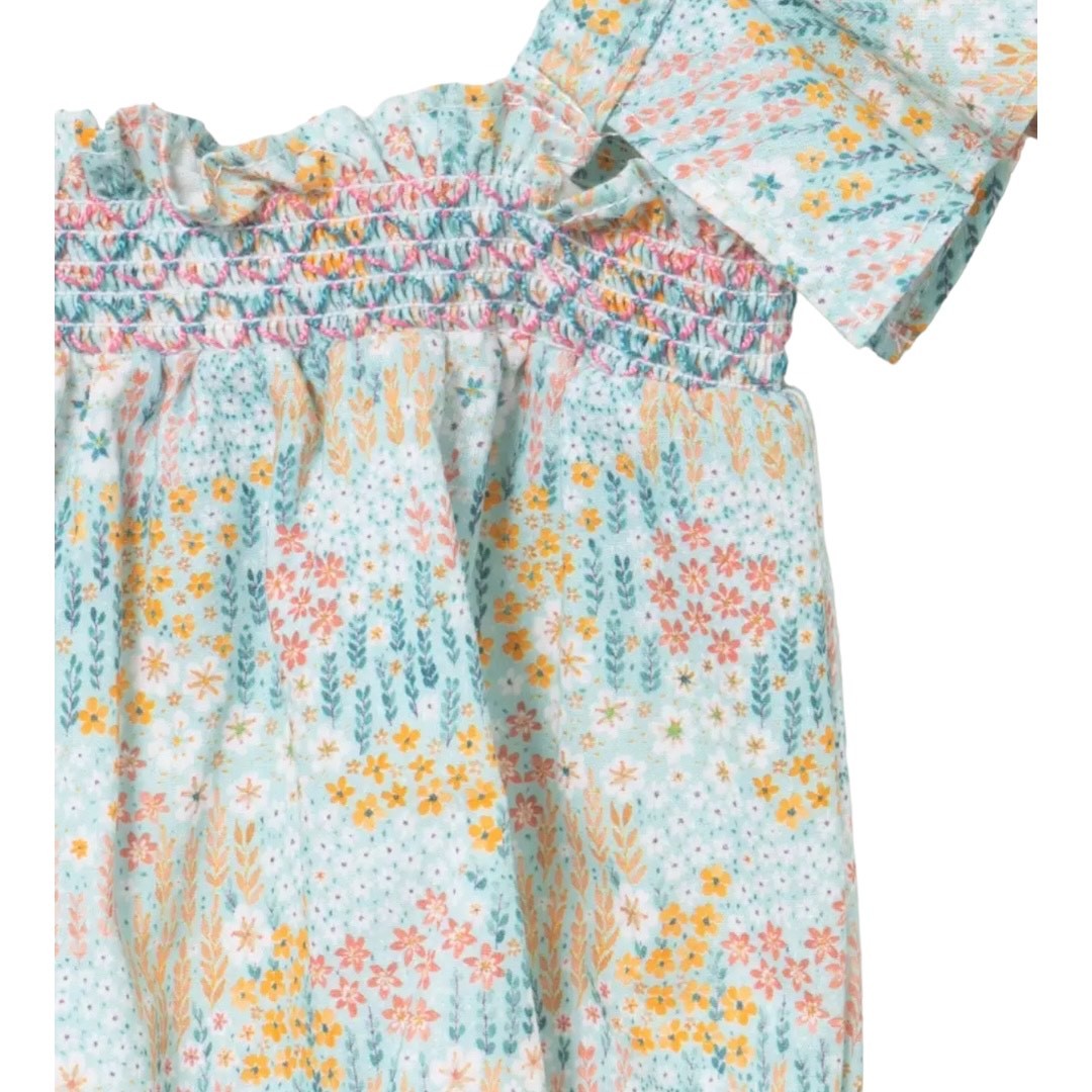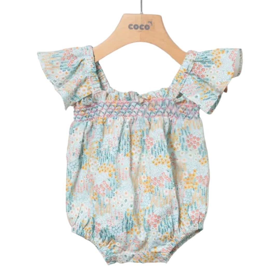 Pelele de color celeste con estampado de florecitas de colores y detalle nido de abeja en el pecho.