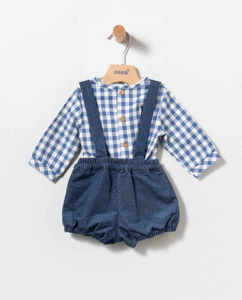 Camisa de algodón con estampado de cuadros en azul y blanco. Apertura en la parte delantera con botones.