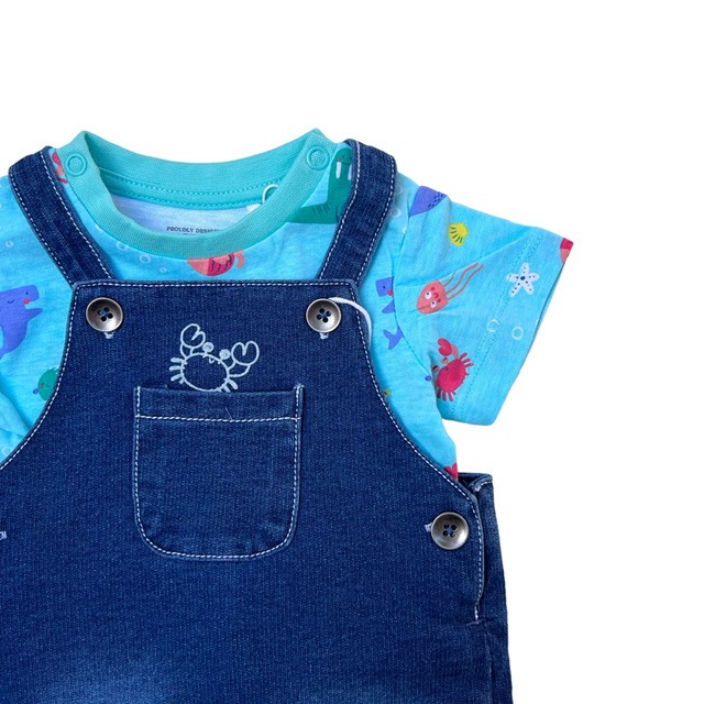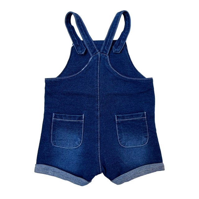 Peto vaquero 100% algodón con elastano en color azul, detalle bolsillo y dibujo cangrejo en el pecho.