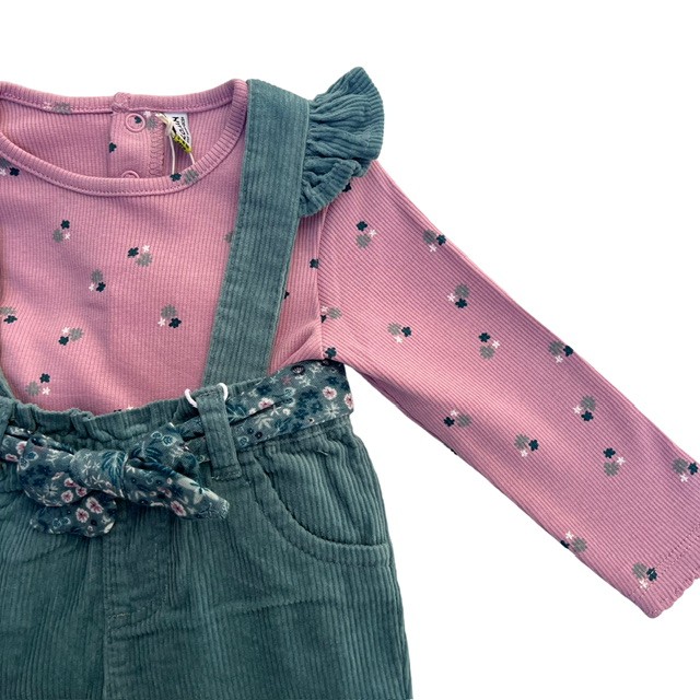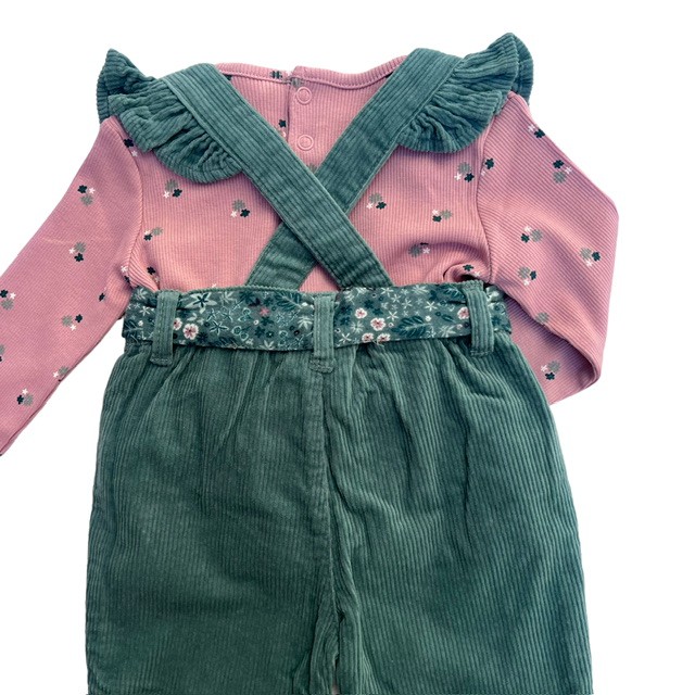 Peto de pana en color verde con tirantes. Incluye cinturón con lazada.