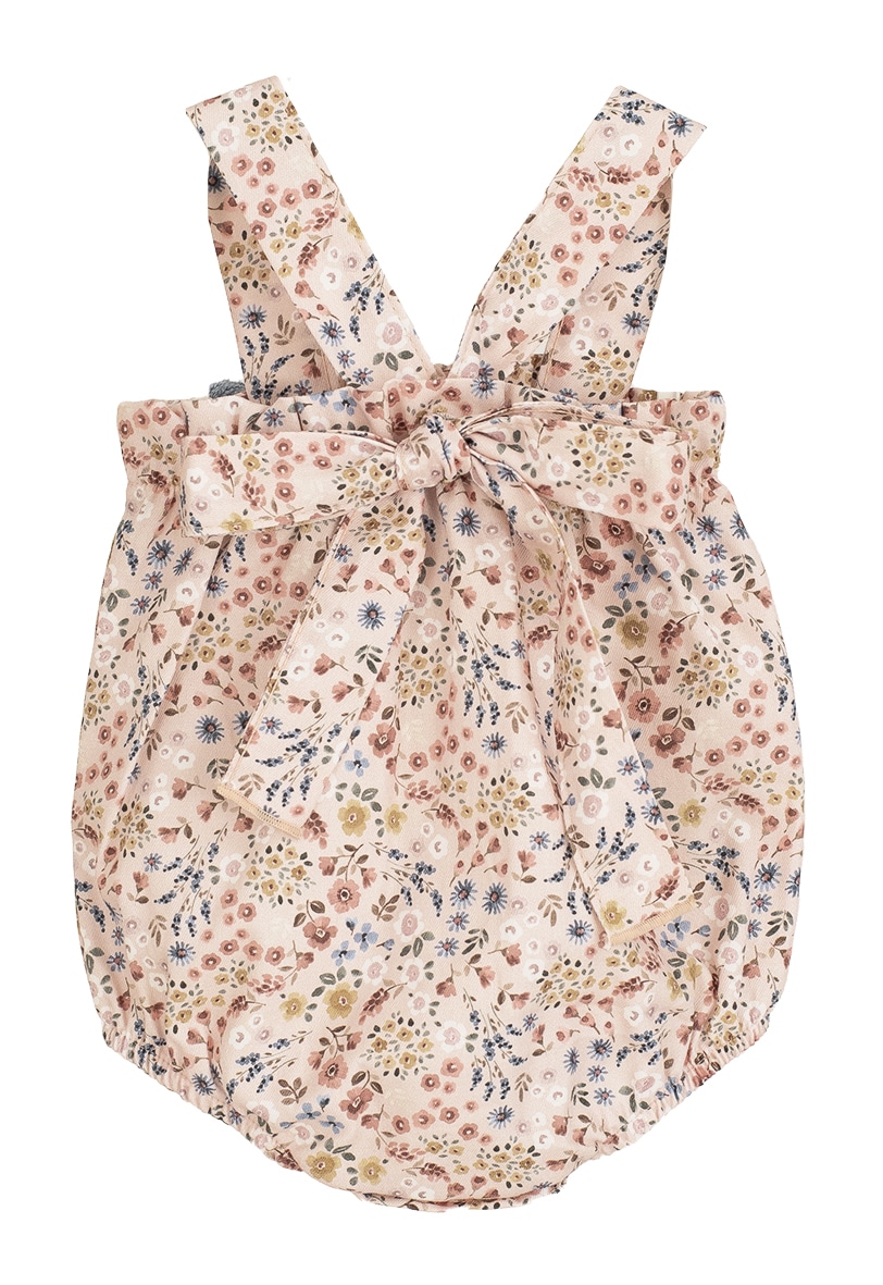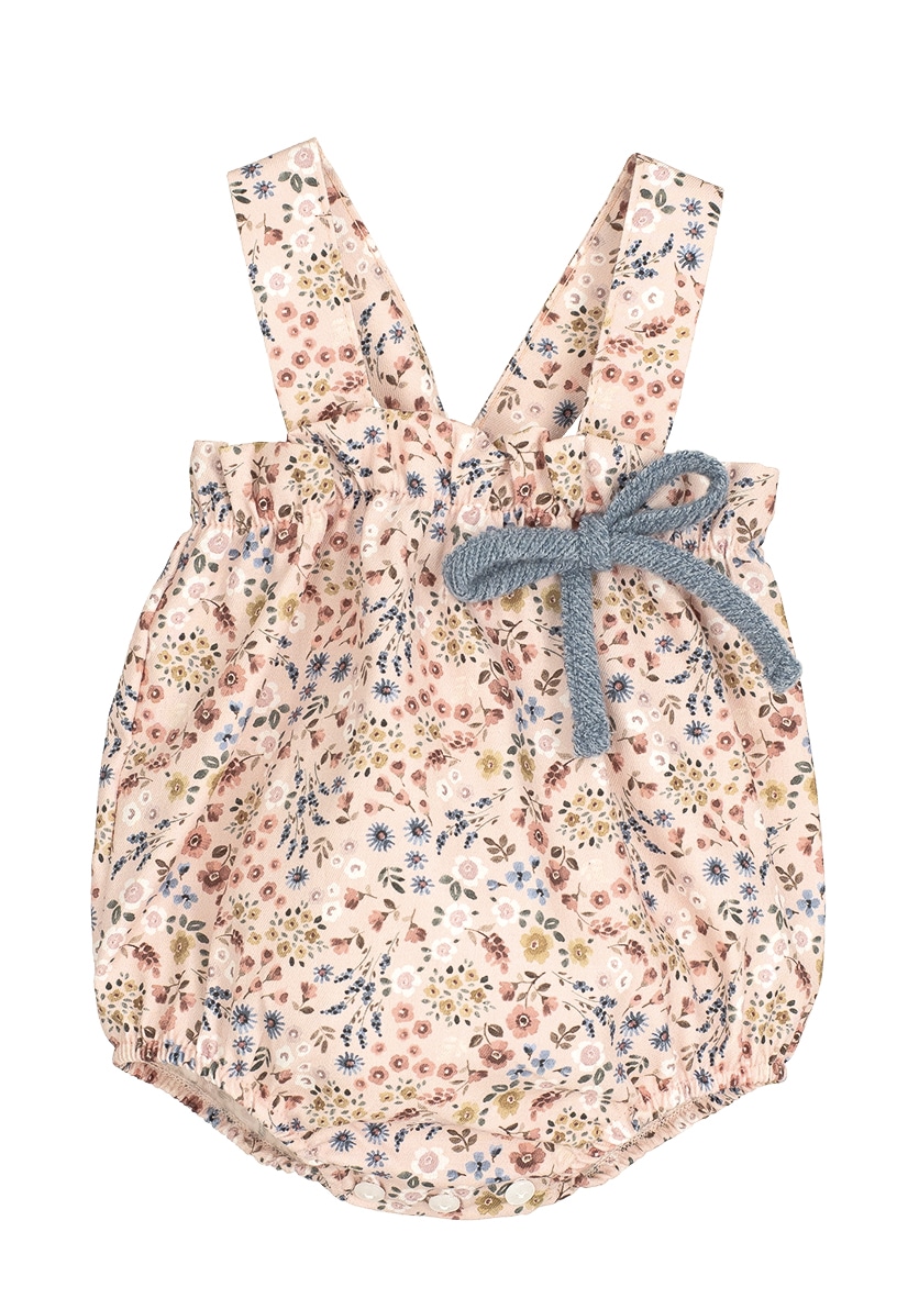 Pelele 100% algodón en color rosa con estampado de flores en tonos azul.