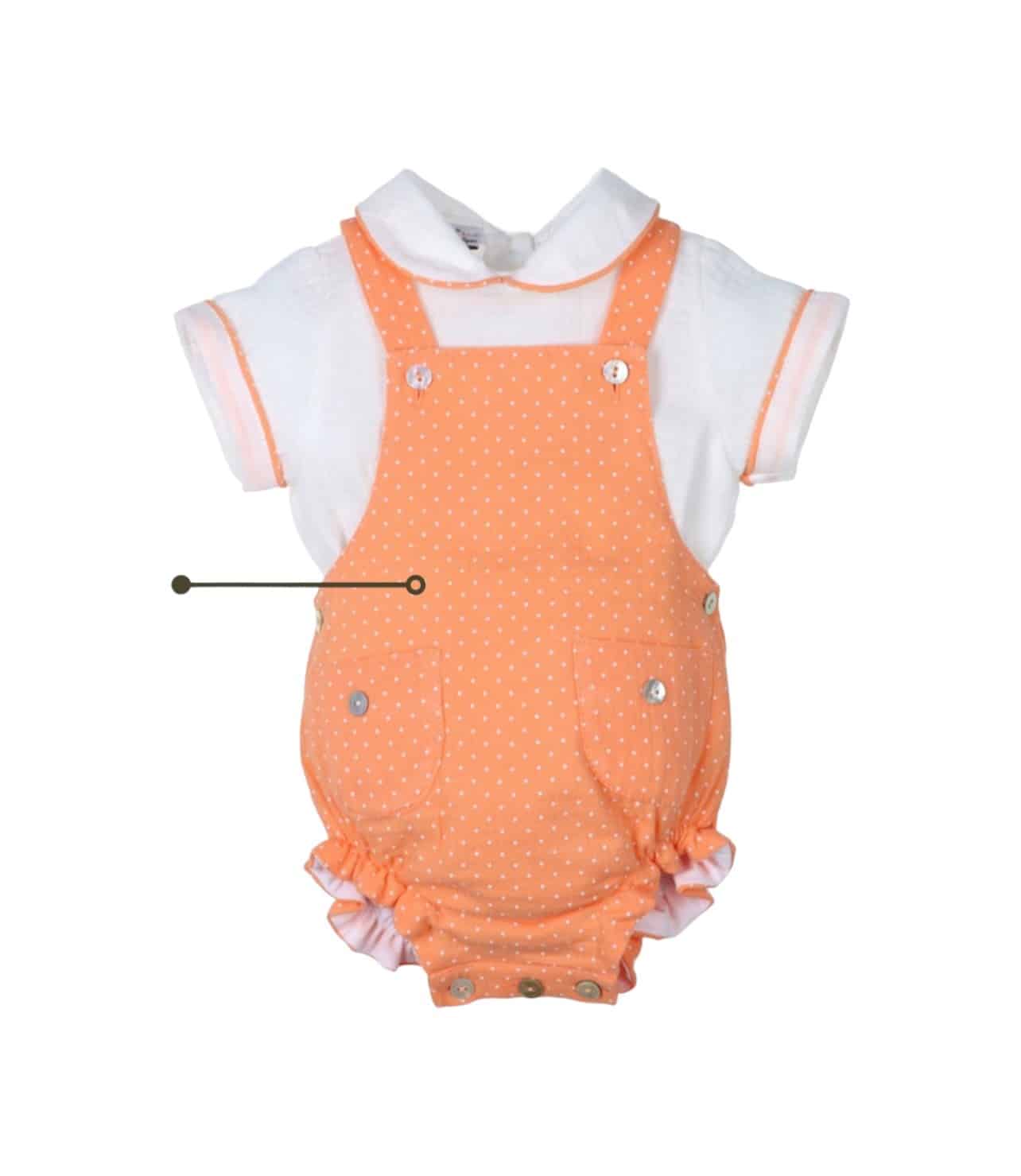 Peto bambula en color naranja con estampado de topitos. Detalle bolsillos