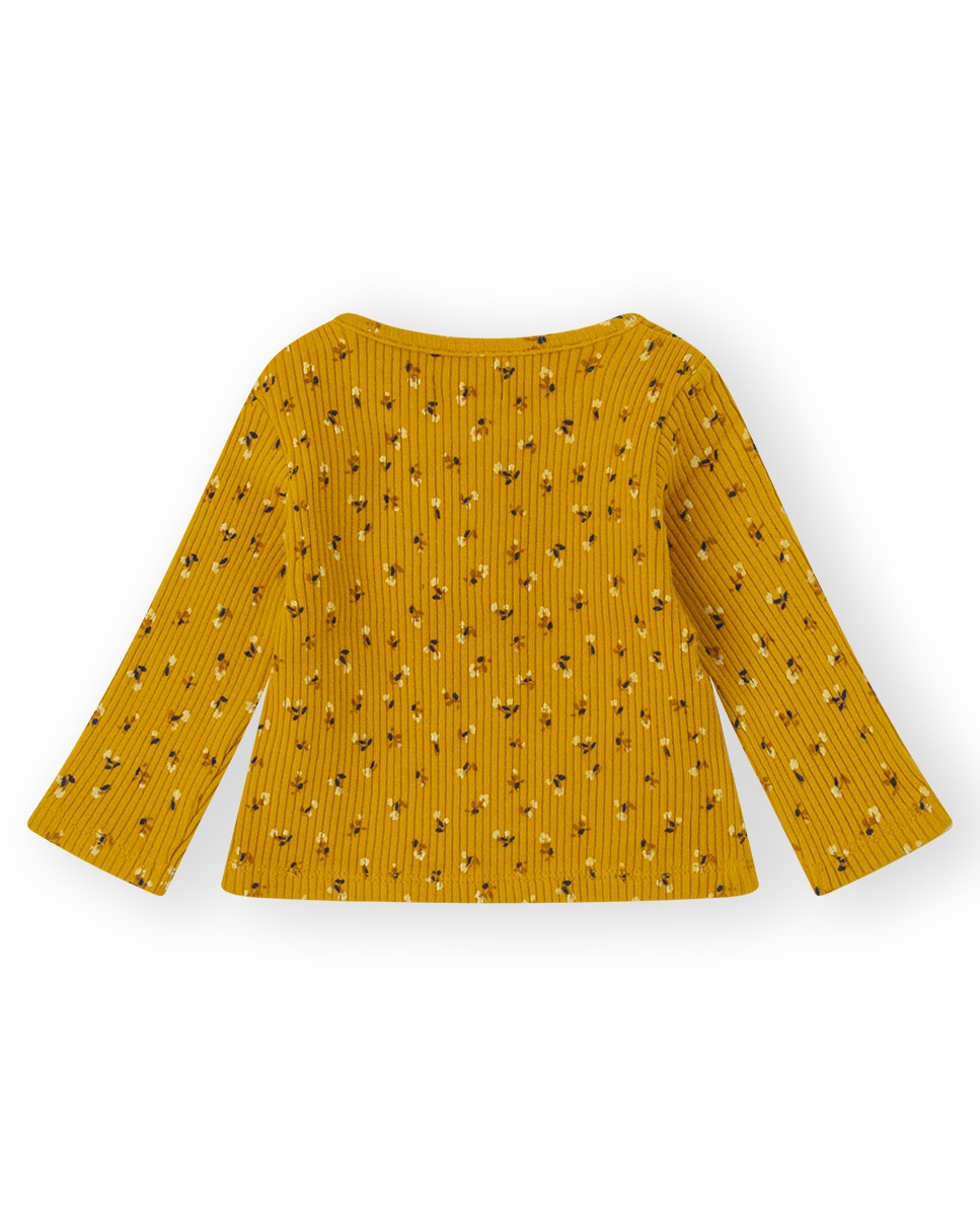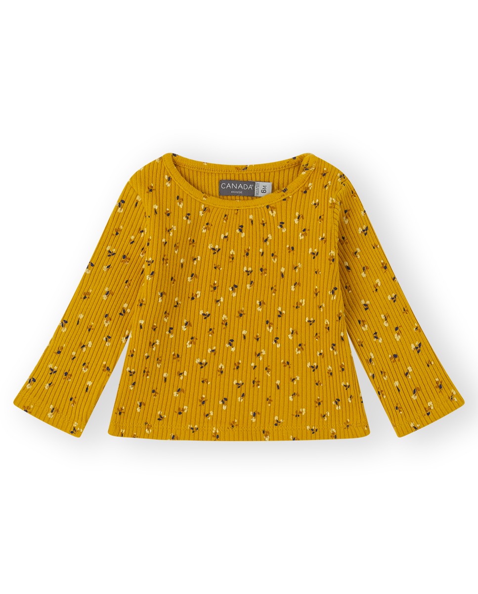 Camiseta 100% algodón de canalé en color mostaza con estampado de flores en azul marino.
