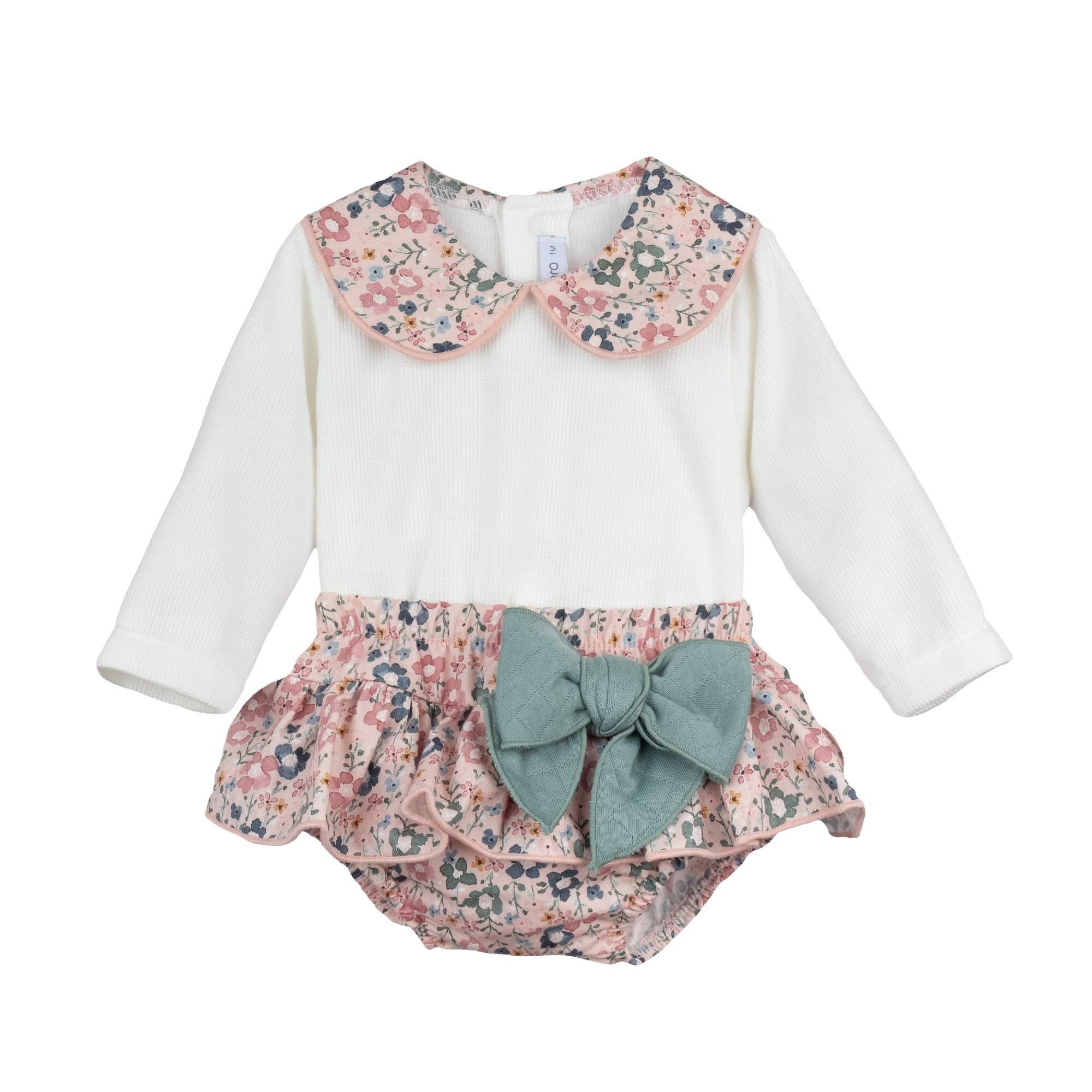 Ranita 100% algodón estampada de flores en color rosa y verde. Detalle volantes y lazo.