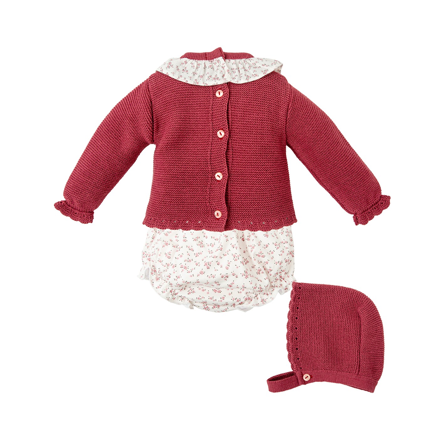 Jersey de punto en color borgoña con detalles trenzados y cuello volante. Apertura en la parte trasera con botones.