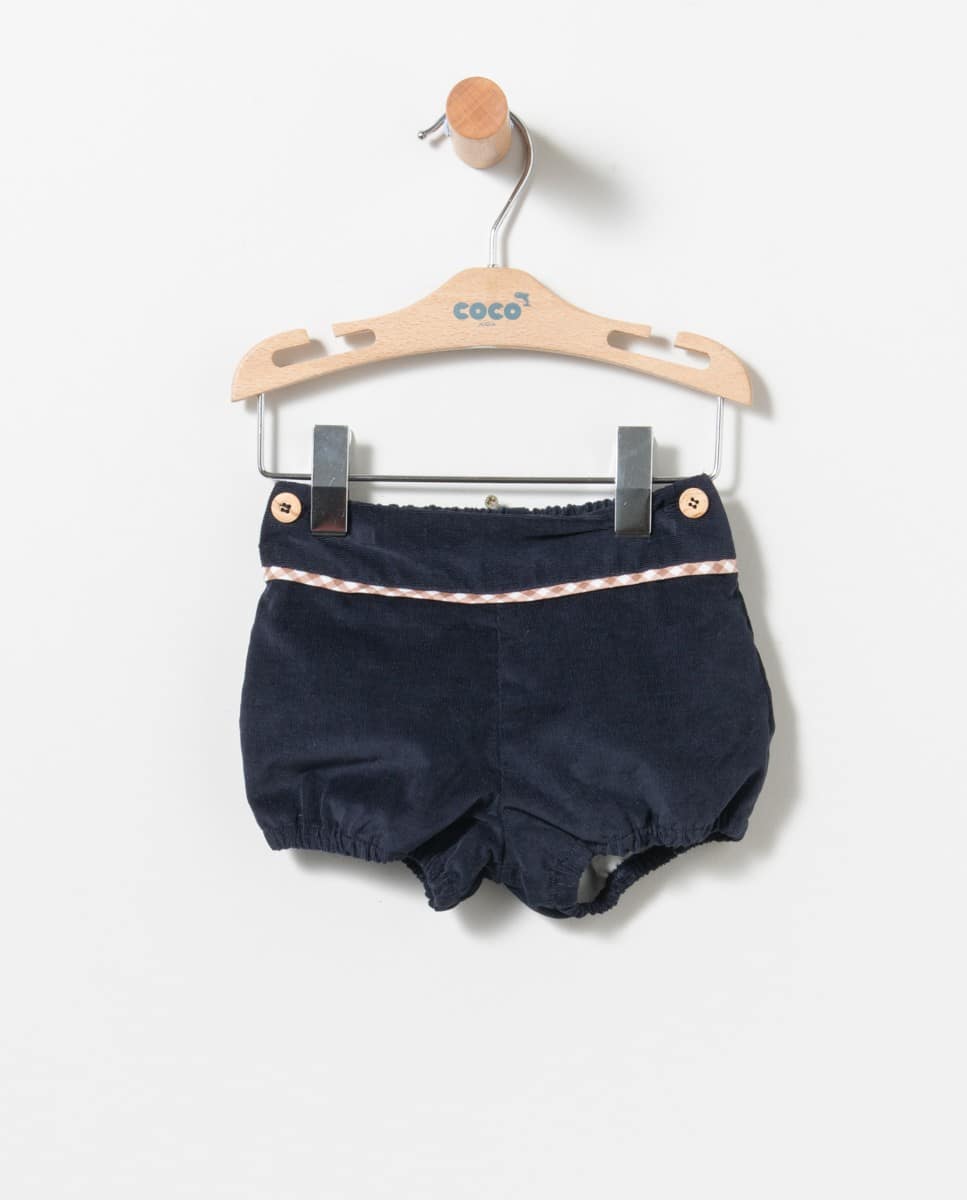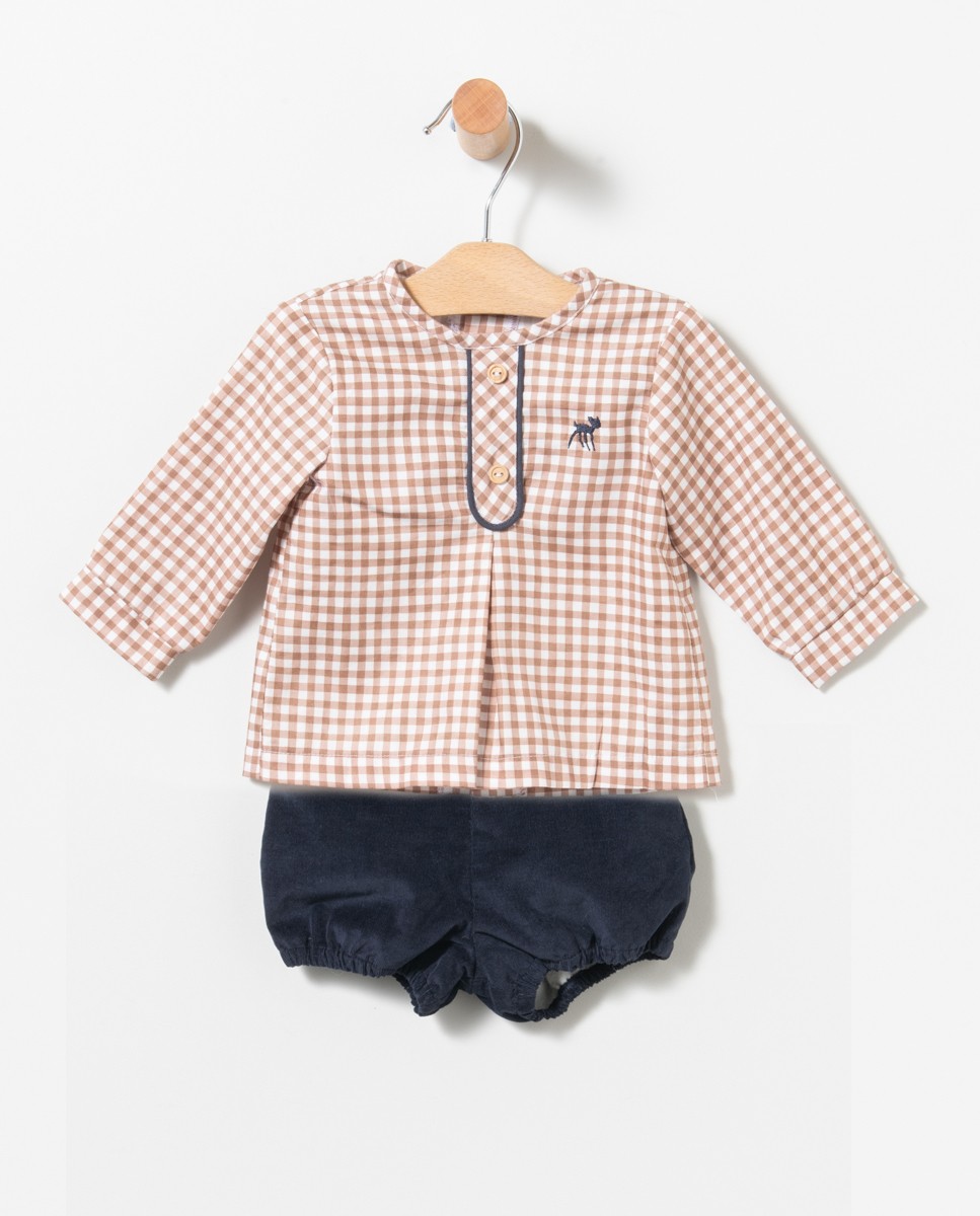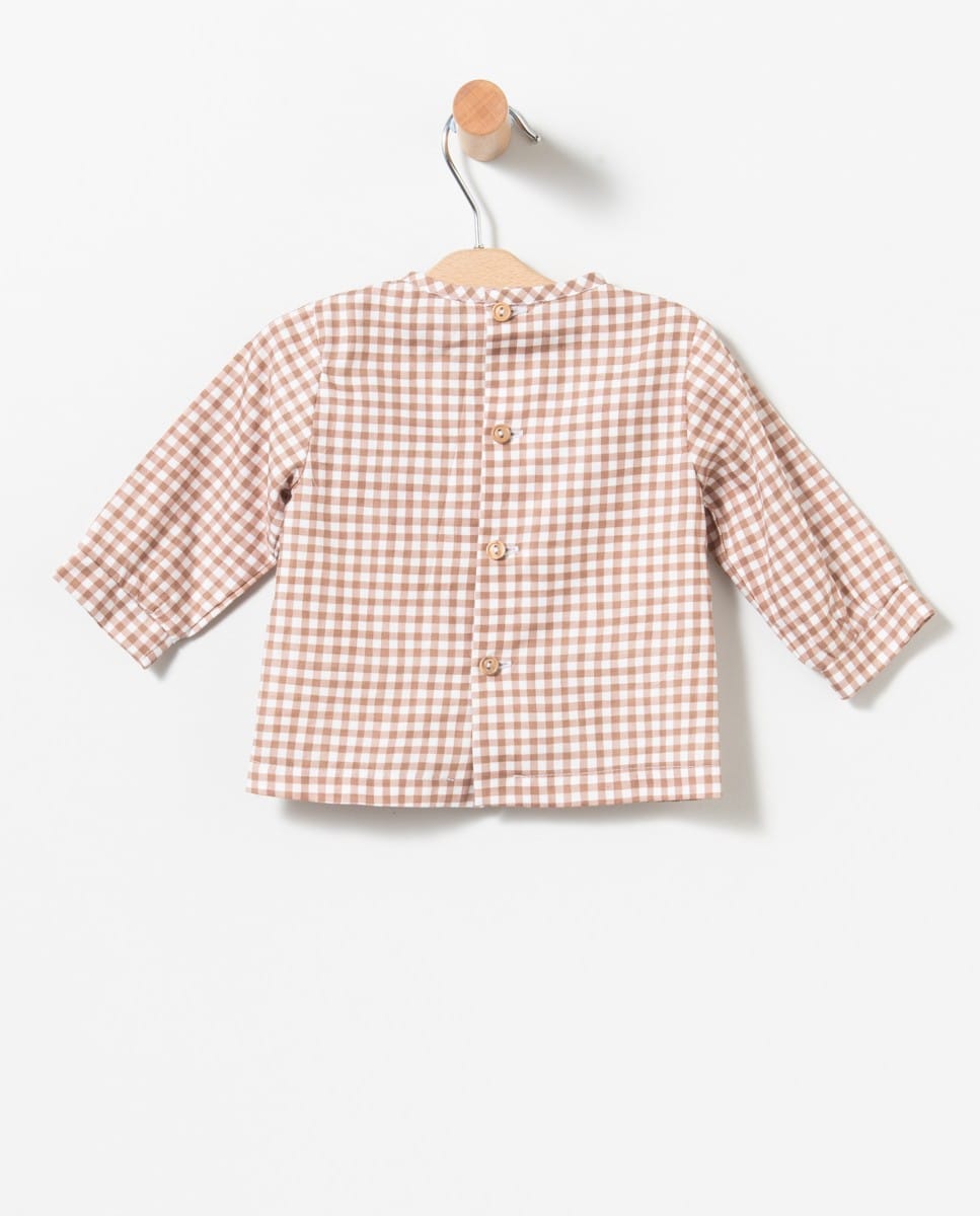Camisa de algodón con estampado de cuadro vichy en color marrón. Detalle en el pecho con ribete en azul marino.