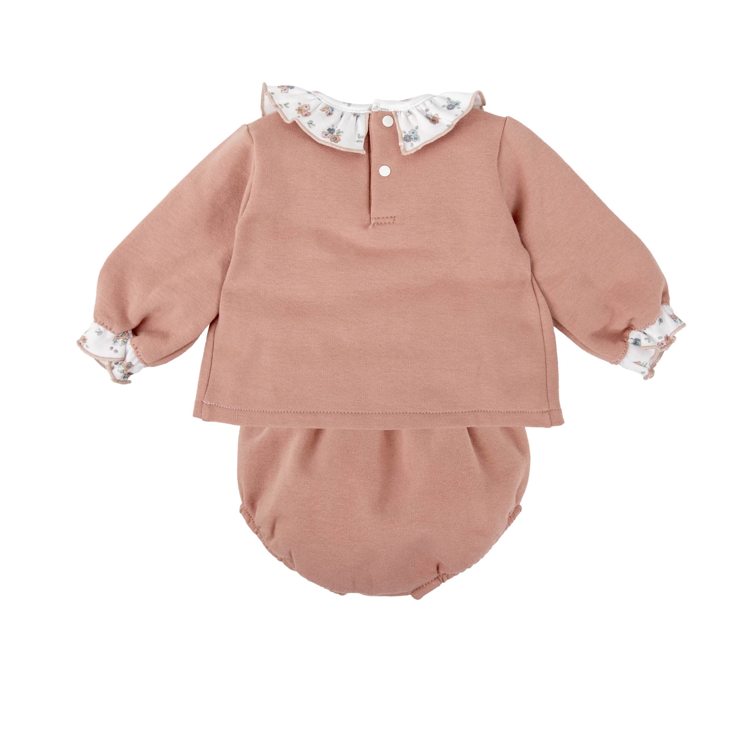 Conjunto sudadera 100% algodón en color rosa maquillaje. Detalle volantes en cuello y puños con tejido estampado con flores.