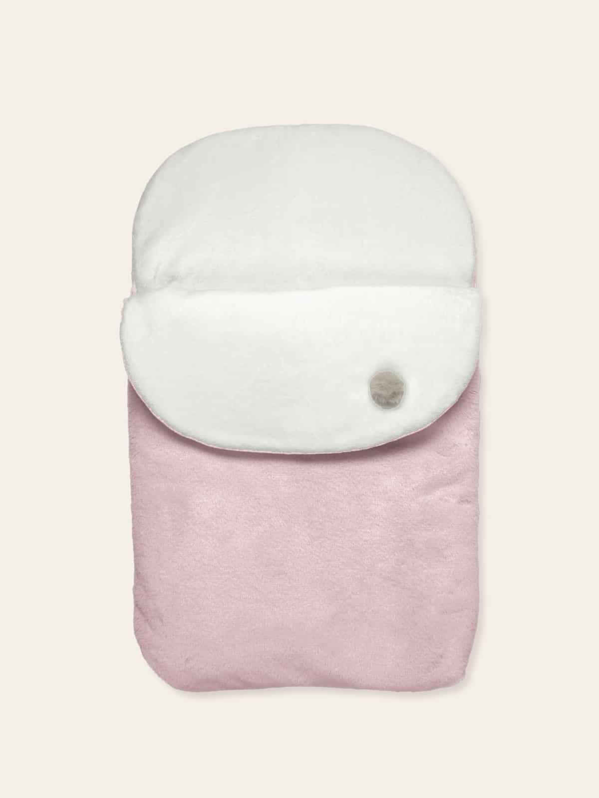 Saco de pelo extra suave de color rosa empolvado con el interior forrado en blanco. Detalle pompón en la solapa
