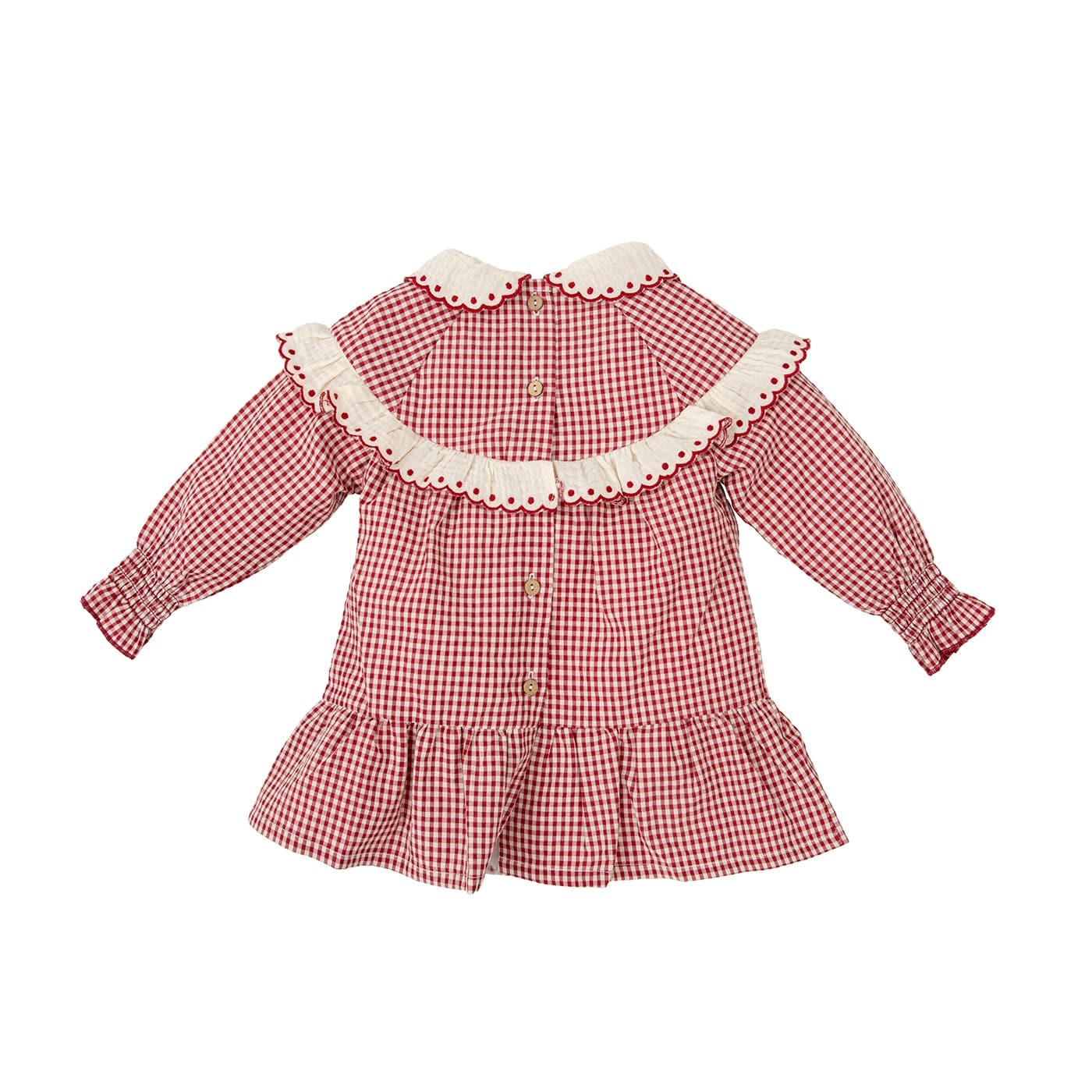 Detalle volantes y cuello con bordados.