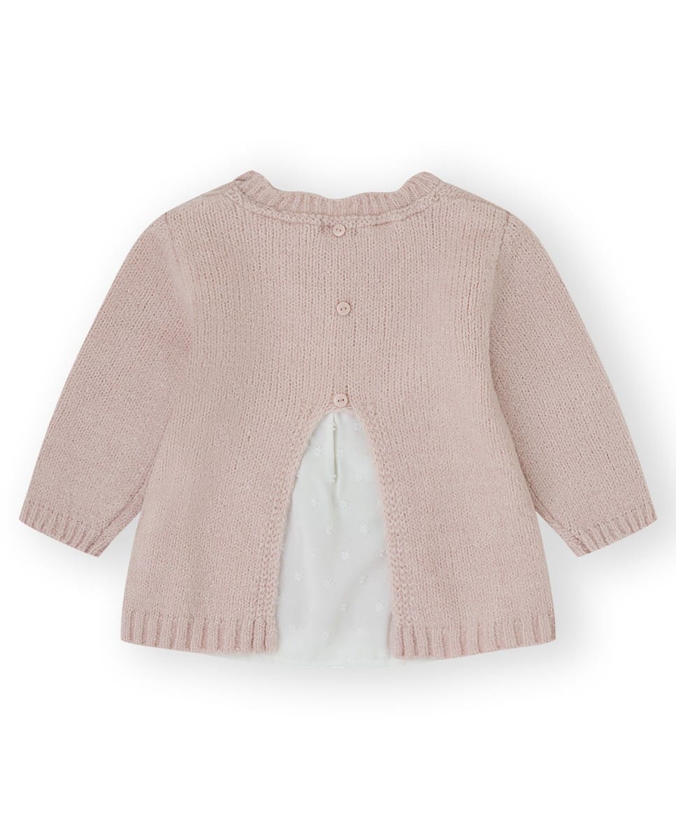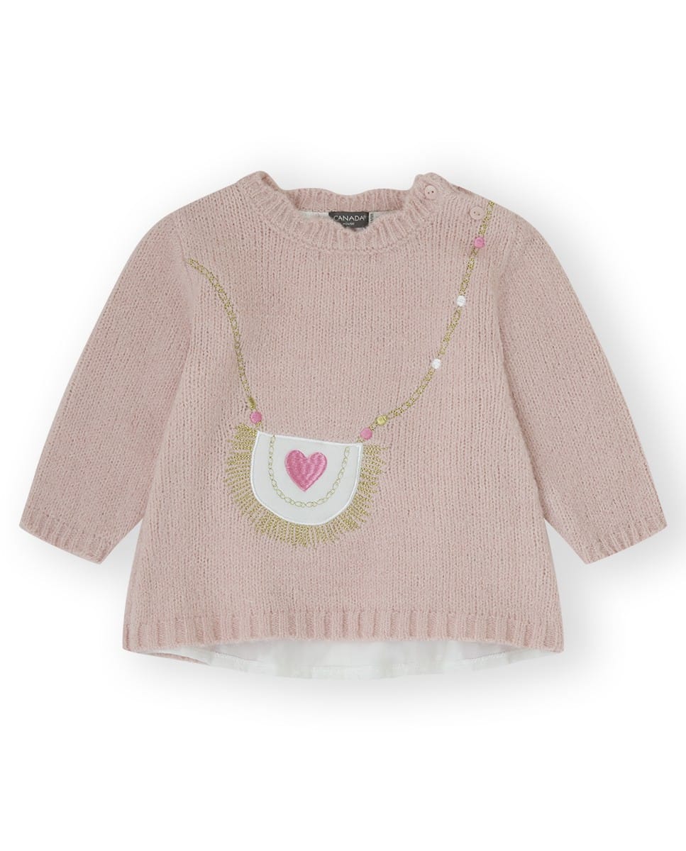 Vestido de lanita en color rosa bebé con detalle bolso bordado en hilo dorado.