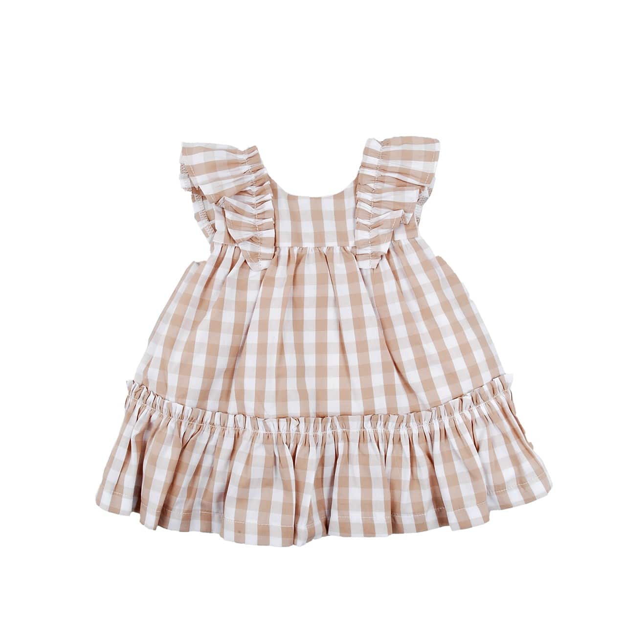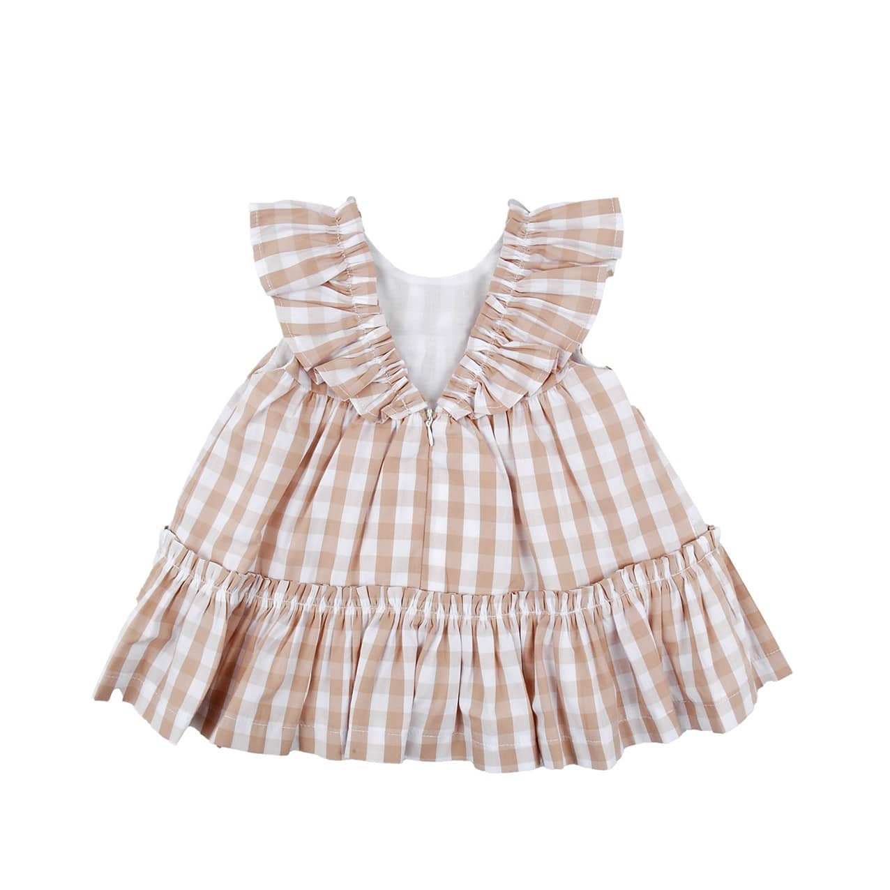 Vestido con estampado de cuadro vichy en color lino y blanco. Detalle volante en los tirantes y forro interior.