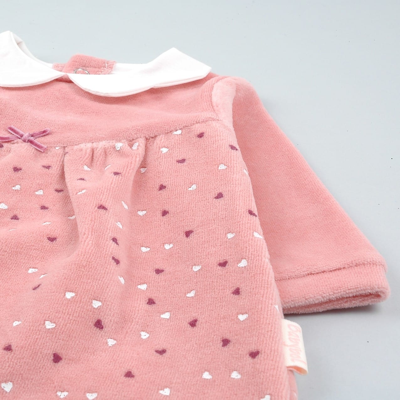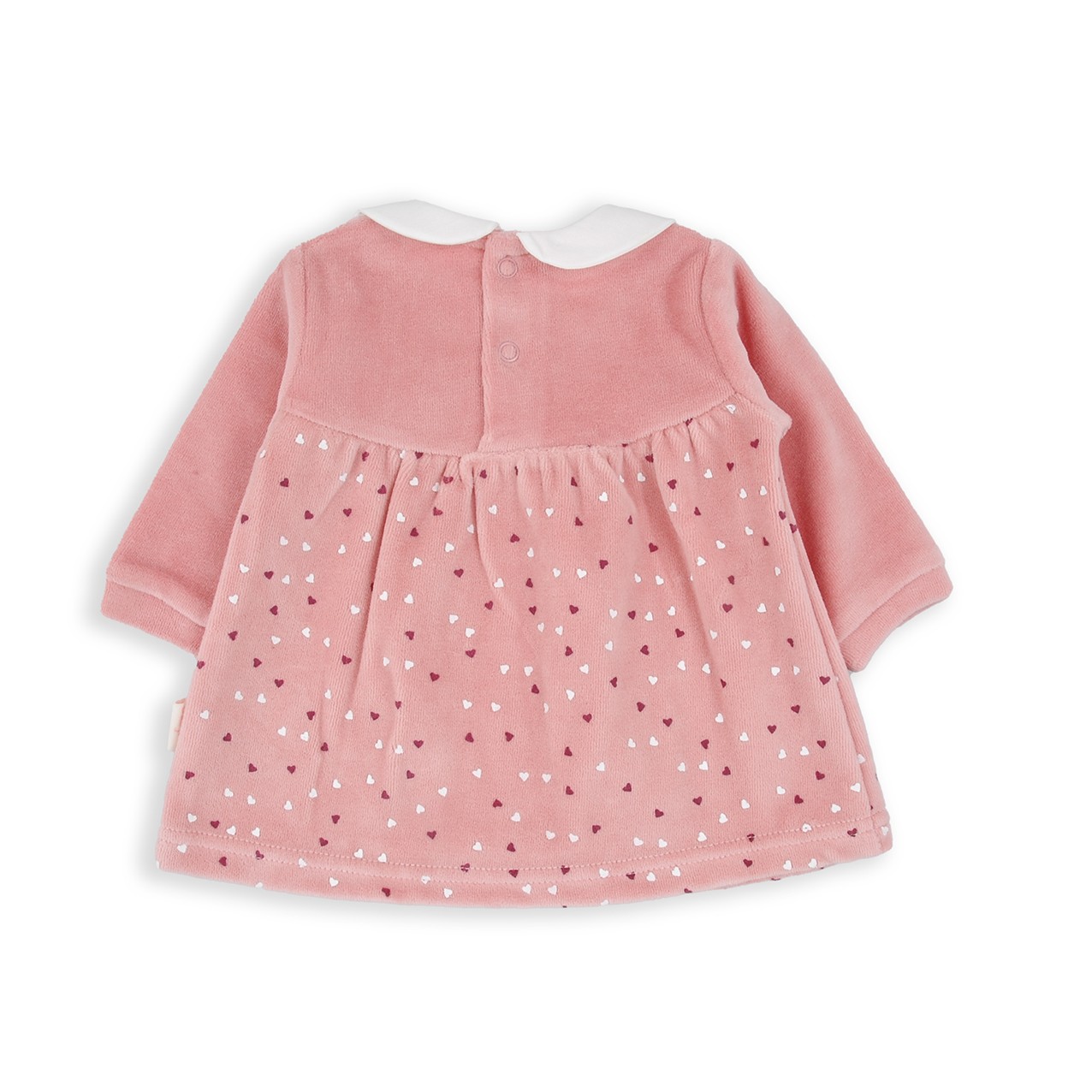 Vestido de color rosa empolvado con estampado de corazones. Detalle cuello camisa en color blanco.